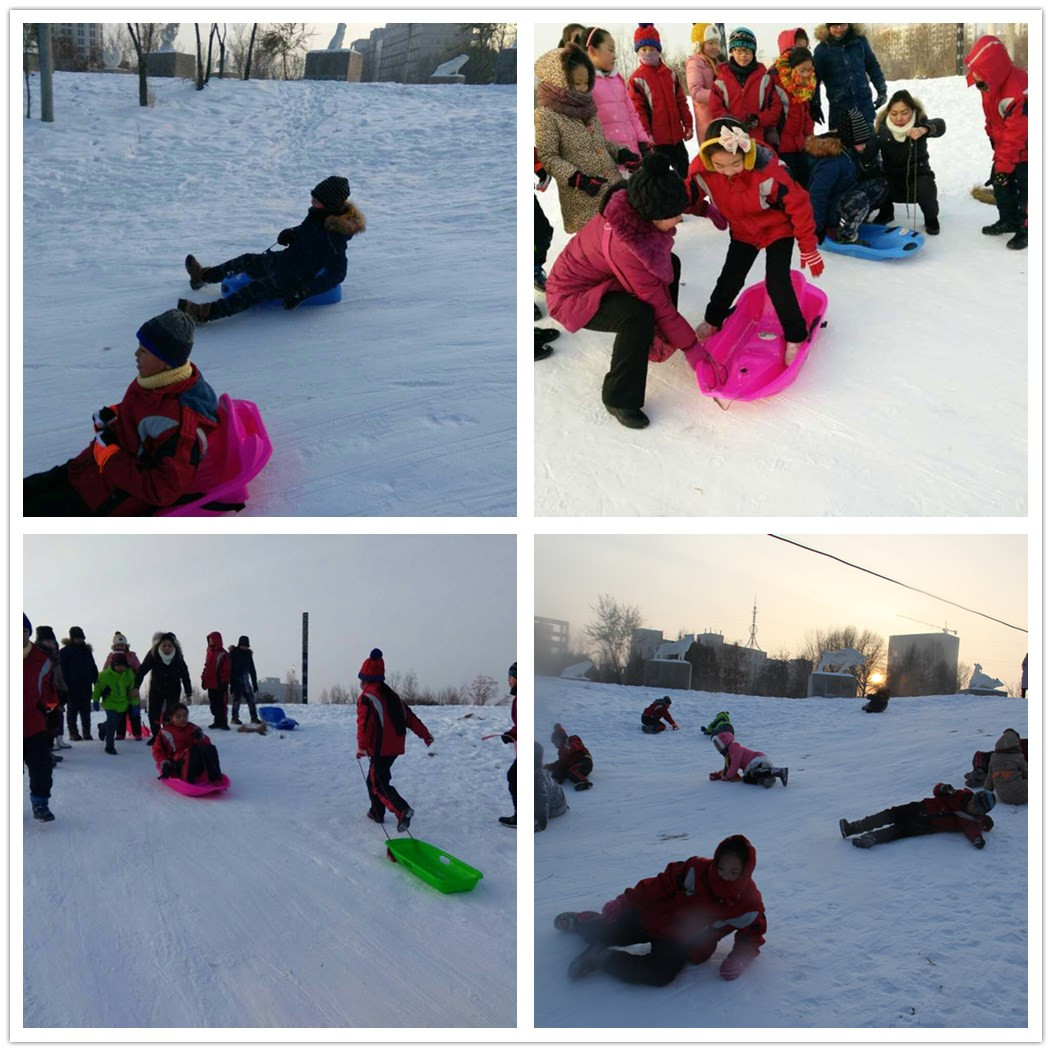 虽然四九的天儿还是冷得逼人,但孩子们还是不甘心乖乖地待在室内,穿上棉服,戴上棉帽,拉上雪板,爬上山坡,分组竞赛让寒冷的冬天变得火热。高高的山坡上,孩子们整齐地排成两队,打头的孩子兴奋又紧张,听到开始的口令就迫不及待地滑下坡,下到坡底,又赶紧拉着雪板往坡上跑,三人过后,两组差距拉开,领先的孩子勇往直前,落后的孩子紧追不舍,等待的孩子呐喊助威,竞争的场面十分激烈。比赛虽有输赢,但快乐不分你我,比赛结束后,所有的孩子都意犹未尽,有孩子提议:“我们滚下坡吧?”“好呀,好呀!”说滚就滚,孩子们一个接着一个往下滚,到了坡底,个个身上沾满了雪,都变成了“白人”,看着彼此,笑得合不拢嘴。